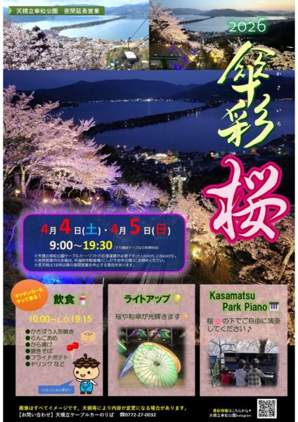 天橋立傘松公園で桜のイベント『傘彩 桜』が開催 2026年3月25日2026年3月26日観光ニュース 天橋立の桜の名所『傘松公園』で桜を楽しむイベント『傘彩 桜』(かさいろさくら)が開催されます。 イベントの内容については、以下のチラシのとおりです。 桜の下でピアノを弾いたり、屋台の食べ物を頬張りながら桜を鑑賞したり、ケーブルカー・リフト沿線や園内のライトアップされた桜をお楽しみください。 〇屋外にストリートピアノコーナーを設置※雨天時は屋内待合コーナー 【イベントに関するお問合せ先】 天橋立ケーブルカーのりば 0772-27-0032