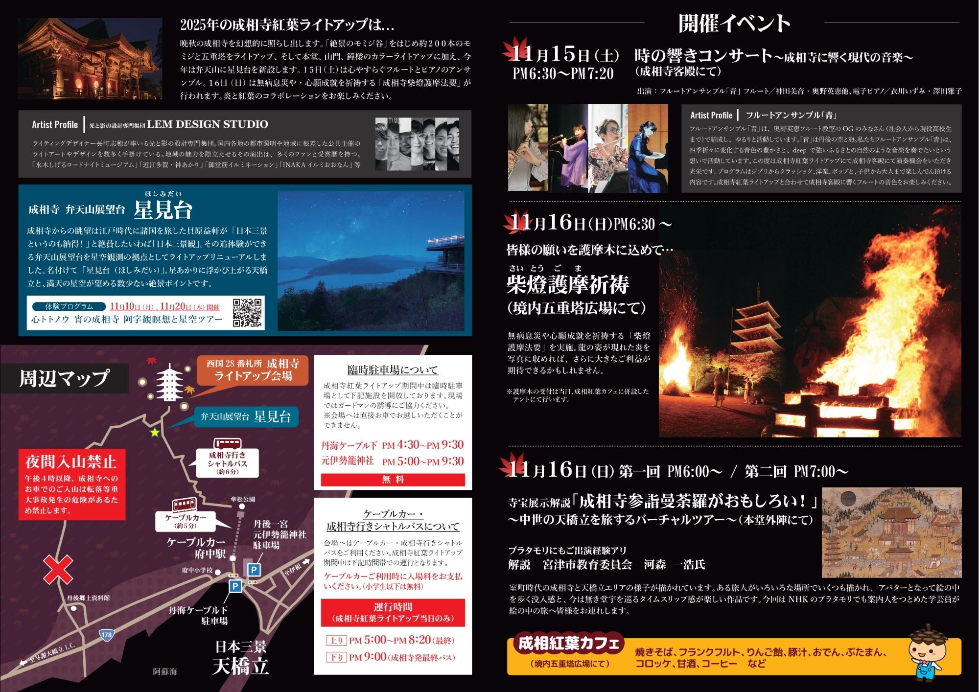 成相寺紅葉ライトアップ開催のお知らせ 2025年10月23日2025年10月23日観光ニュース 11/15・16の土日、天橋立にある成相寺で紅葉ライトアップイベントが開催されます。 今年は新たに観覧エリアが拡大され、弁天山展望所に星見台が開設されます。 また、11/8~24の期間、成相寺もみじウィークも開催され、寺宝の公開やお守り手形の授与などこの時期だけの特別な参拝企画が実施されます。